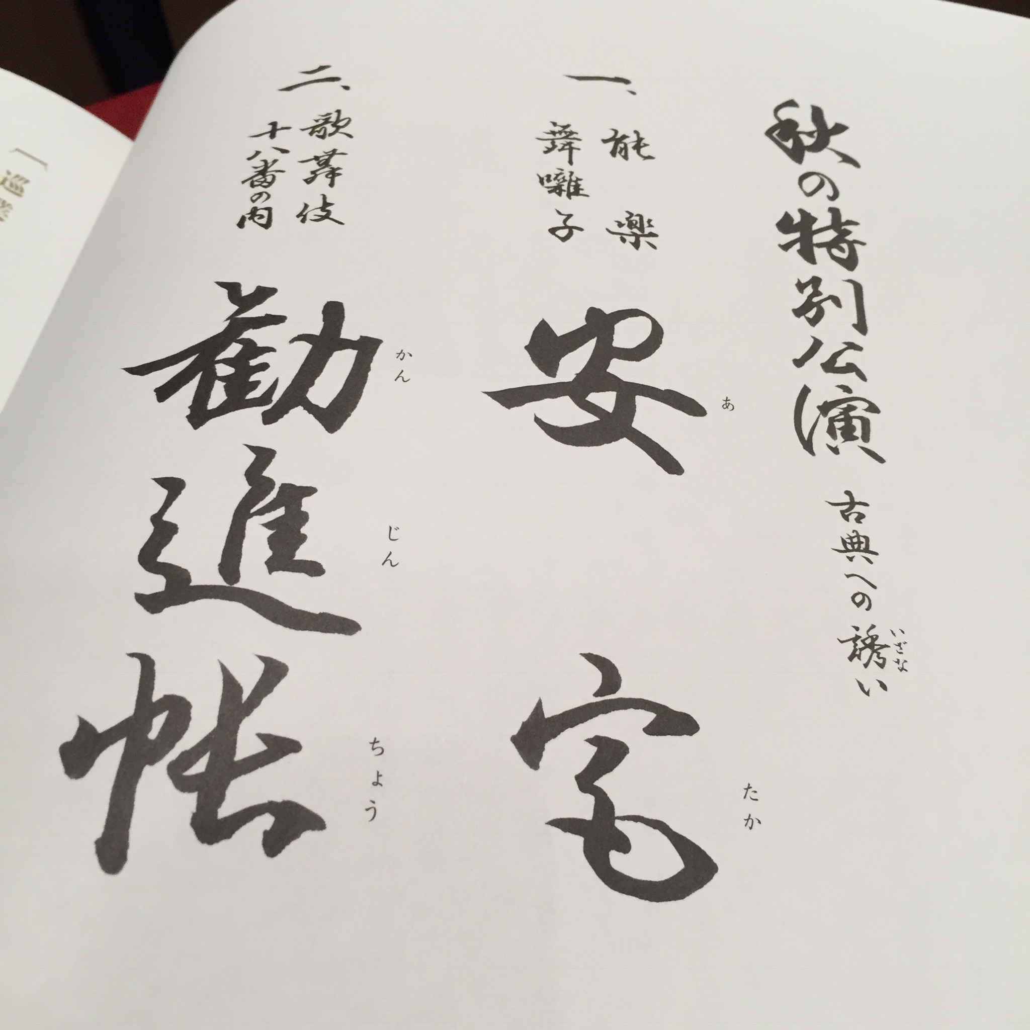 最初に10分程度の題材の説明。その後、能が始まります。能の「安宅」を全部上演すると1時間ちょっとかかると思うのですが、今回は20分のみ。舞囃子なので、装束などはありません。でも十分です。勧進帳を読み上げた後、弁解や義経がいる所へ、富樫がお酒を持って現れるところを今回は上演して下さっています。