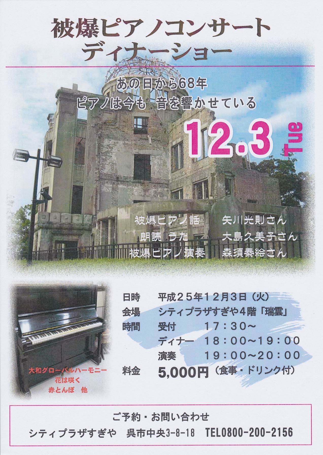 12月3日(火)18時より、呉のシティプラザ すぎや 4階の「瑞雲」というところで、「被爆ピアノコンサート ディナーショー」を行います!