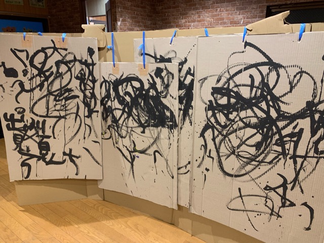 そして、段ボールでサンドイッチマンになったスタッフを追いかけて、子供達や大人が入り混じって、筆と墨で自由に書く描く!