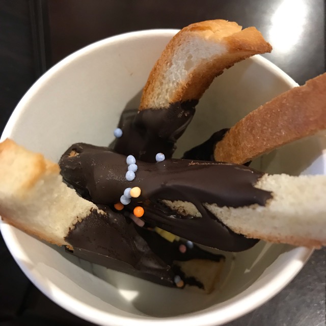本日のおやつは、すごいぞー!昨日、フレンチトーストだったそうで、食パンの耳を取っておいて、それをカリカリにトーストして、溶かしたチョコをディップして、固まる前に、飾り付け♡