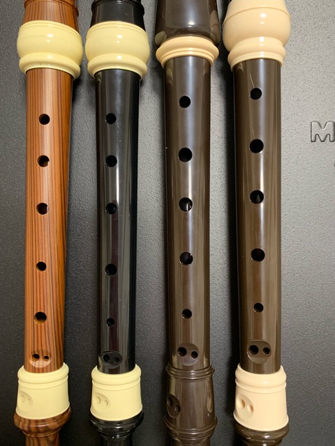 左から、SUZUKI バロック式、SUZUKI ジャーマン式、アウロス、ヤマハのそれぞれソプラノリコーダーです。