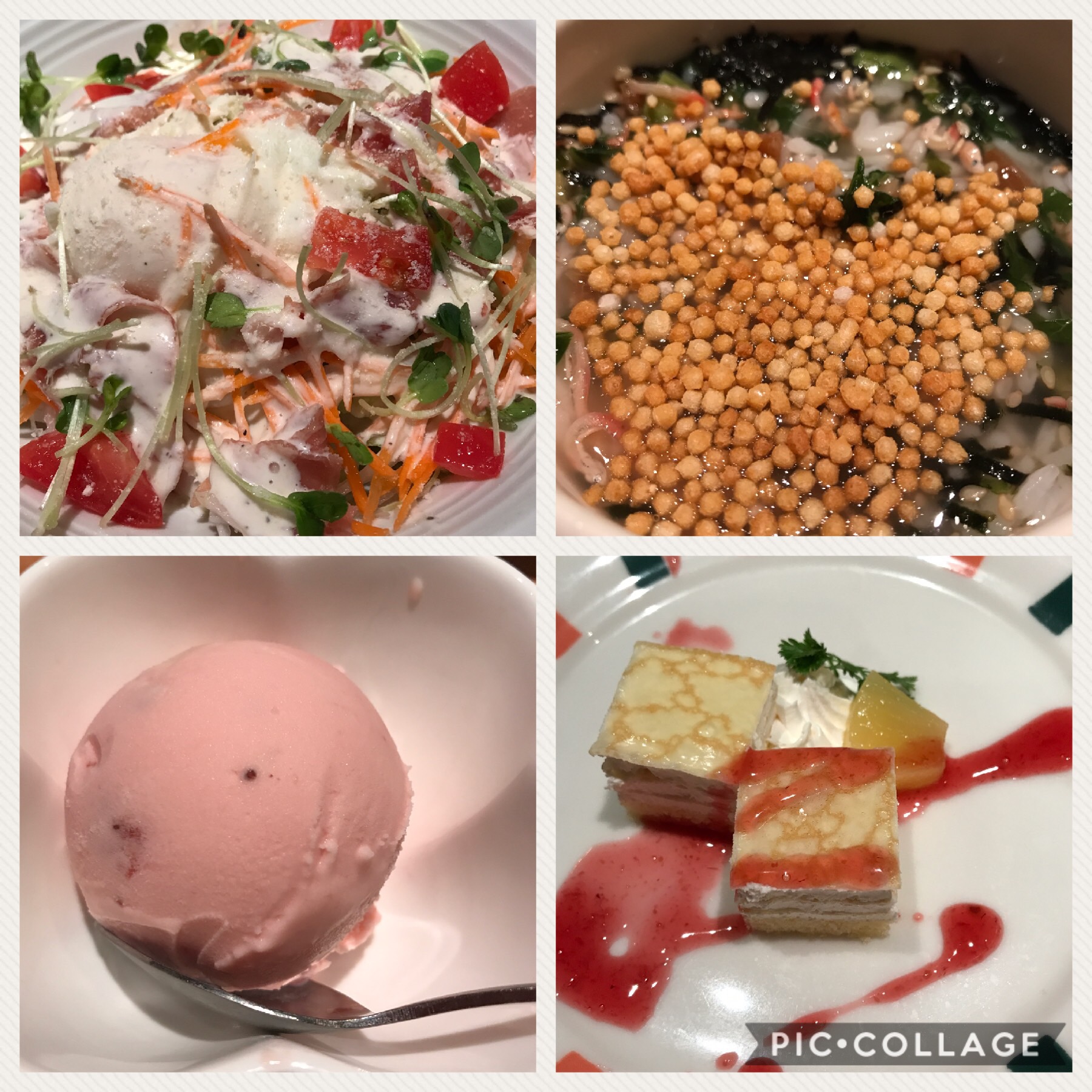 生ハムと温玉乗せシーザーサラダ、あられたっぷりお茶漬け、イチゴアイス、ミルクレープ。