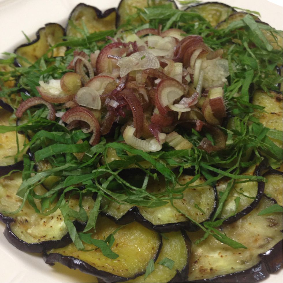 冷やした茄子の上に、どかーんと広げます。じゃこがあればトッピングなお良しです。