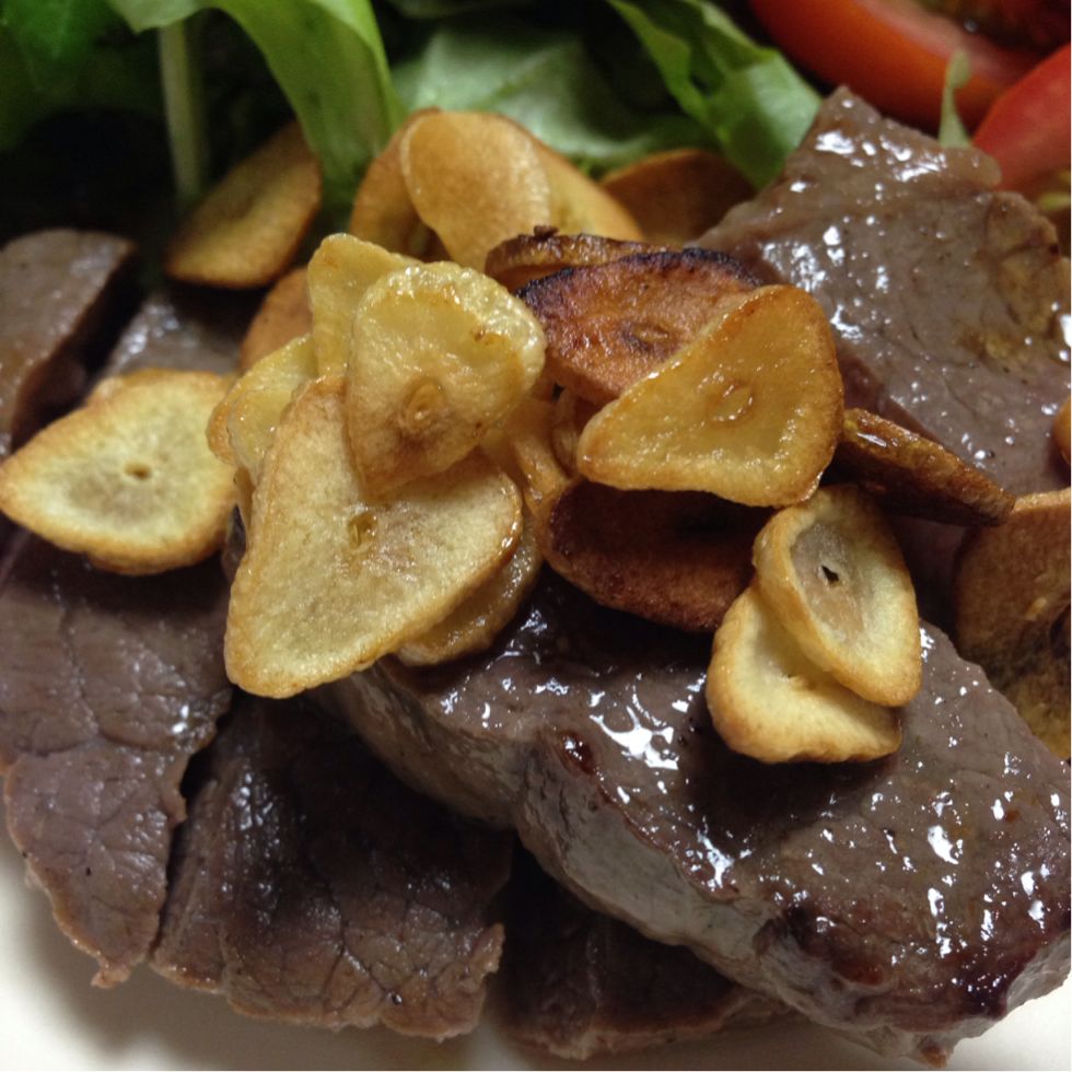 今晩は、お肉を食べました。ニンニクチップたっぷり作って。
