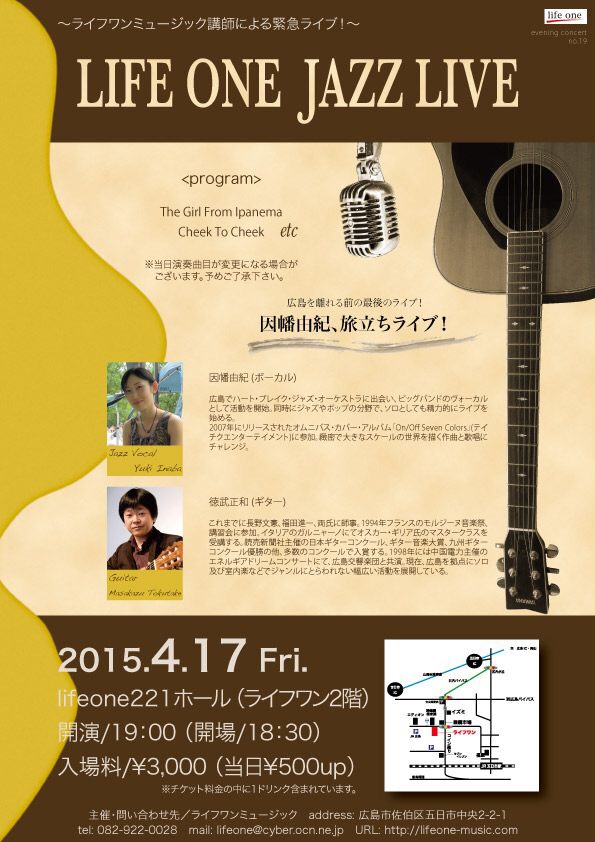 因幡由紀先生が、広島を離れられるために、お別れコンサートを開催することに。ギターの徳武正和先生との共演。