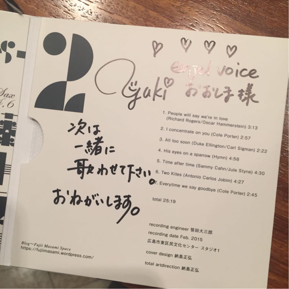 私はJAZZは無理なので、聴くだけなのですが、いつか因幡先生と共演したいね、と互いに話しつつも実現出来なかったので、CDにこんなメッセージが。
