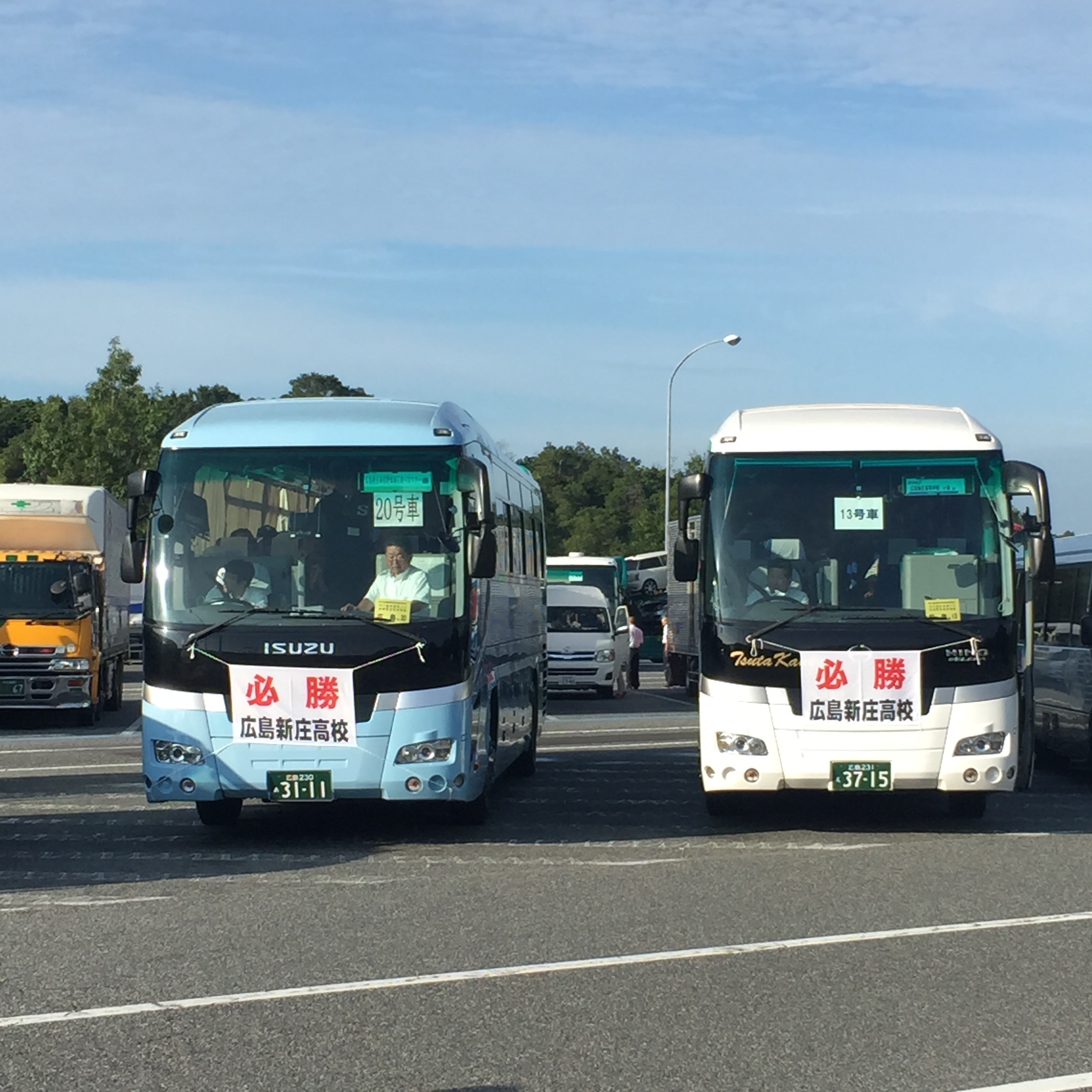 途中サービスエリアで、甲子園に向かう団体さんと出会いました。なんと!広島県代表、新城高校ではありませんか!おおお!頑張るのだー!応援団の皆さんでした。朝早くから大変だなと思いましたが、コンビニで大量の麦茶やスポーツドリンクを購入していました。うわー、大変。でも、是非全力で応援して下さいね!20台以上のバスでの移動でした。す、すごい!私達も頑張らねば、と訳のわからない気合いの入れようでした(^^)