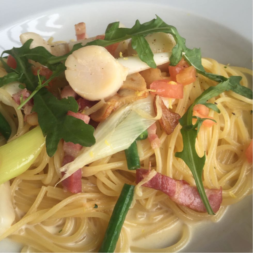 ホタテと白葱のホワイトソース仕立て。美味。でも今日は、塩が強めでした。シェフ、お風邪かな?