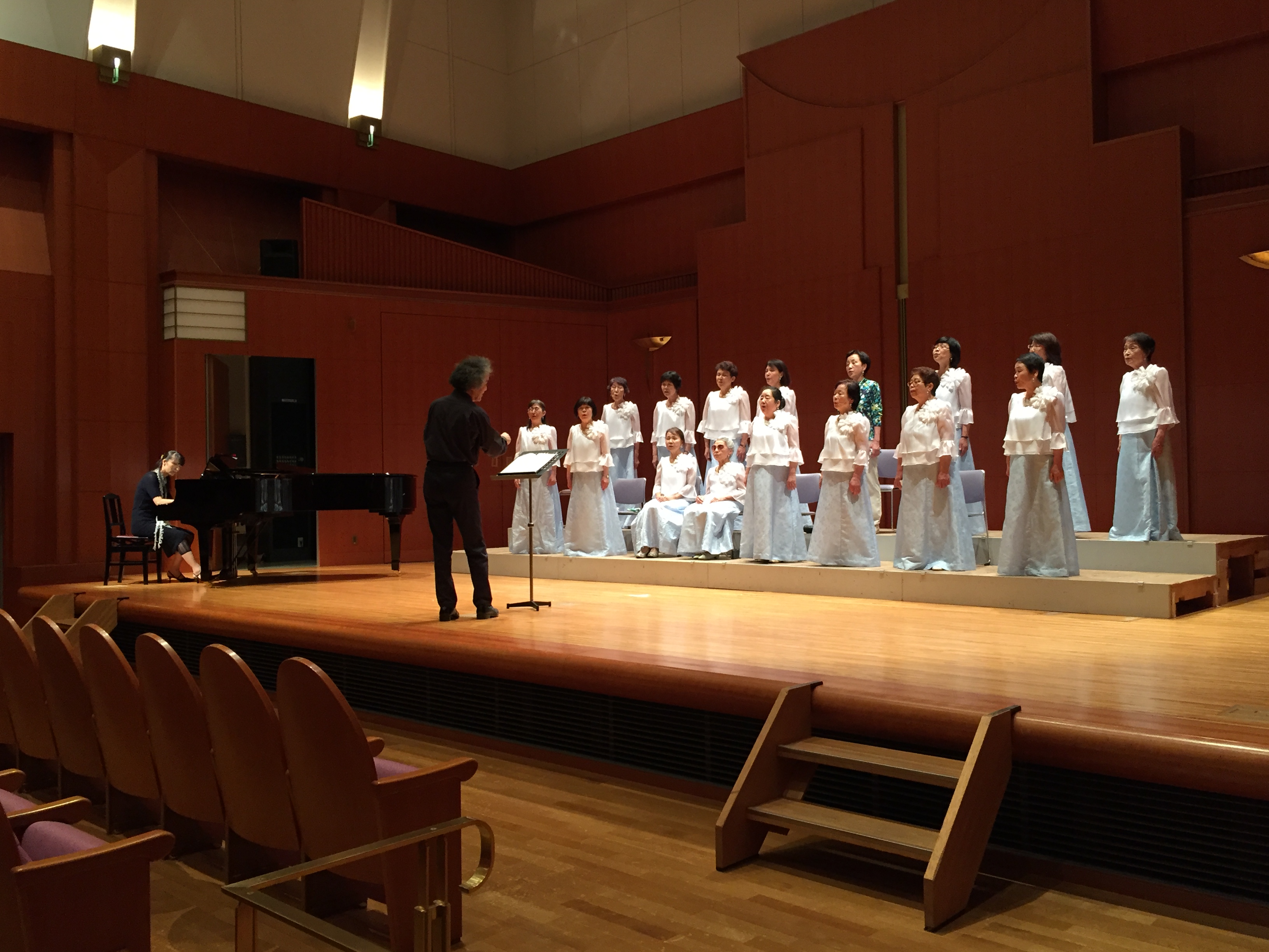 佐伯康則先生率いる女声合唱「松ぼっくり」さんのコンサートを6月11日に控え、今日はホール練でした。当日と同じ小ホールで練習中です。