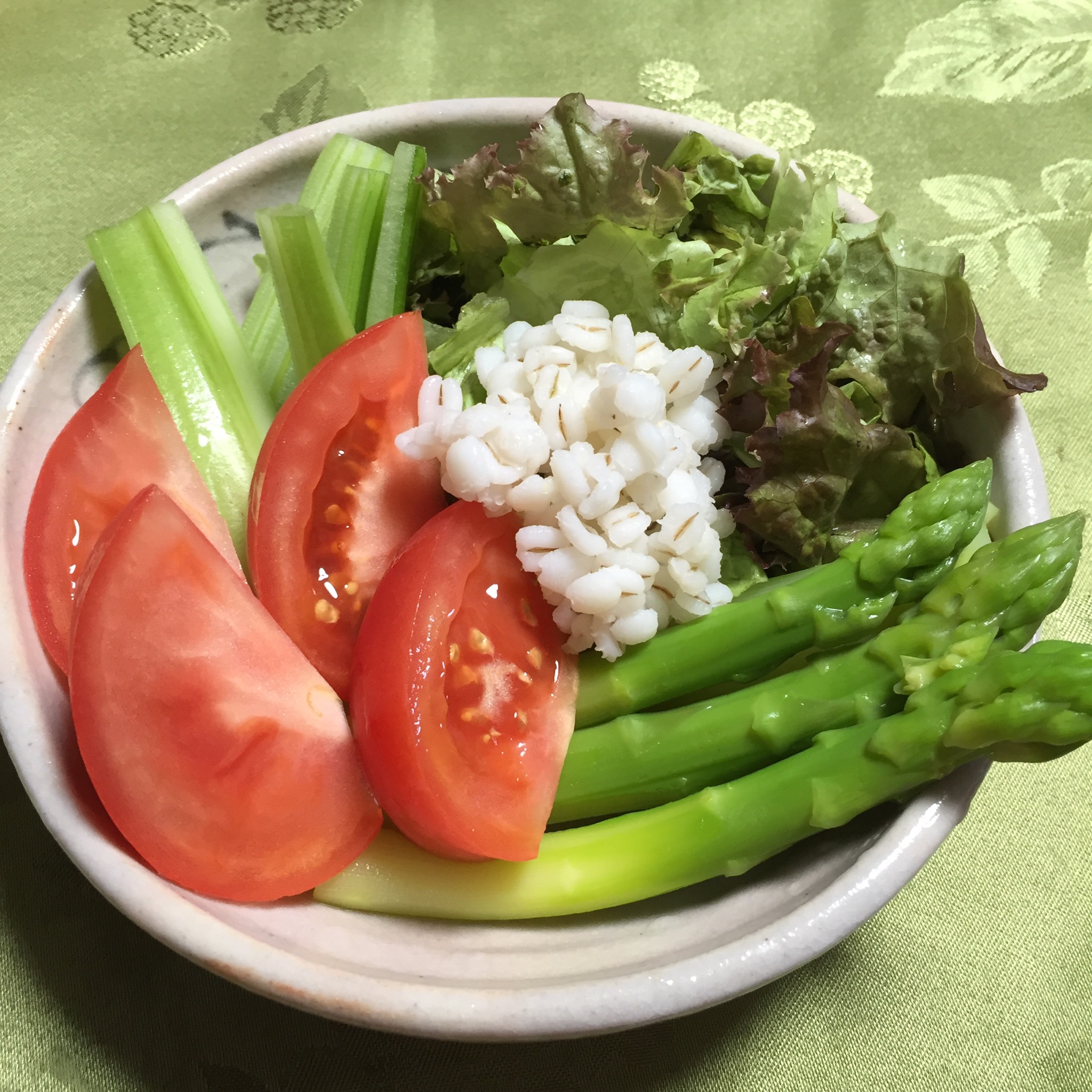 こんな日は食欲が落ちます。県北のアスパラガス。これが美味しいの!トマトにセロリ。美味しい美味しいサラダでした。こういう感じなら食べられる!あ、真ん中の白いのは、大麦です。押し麦。ほんとは、この倍、盛って食べています(^^)