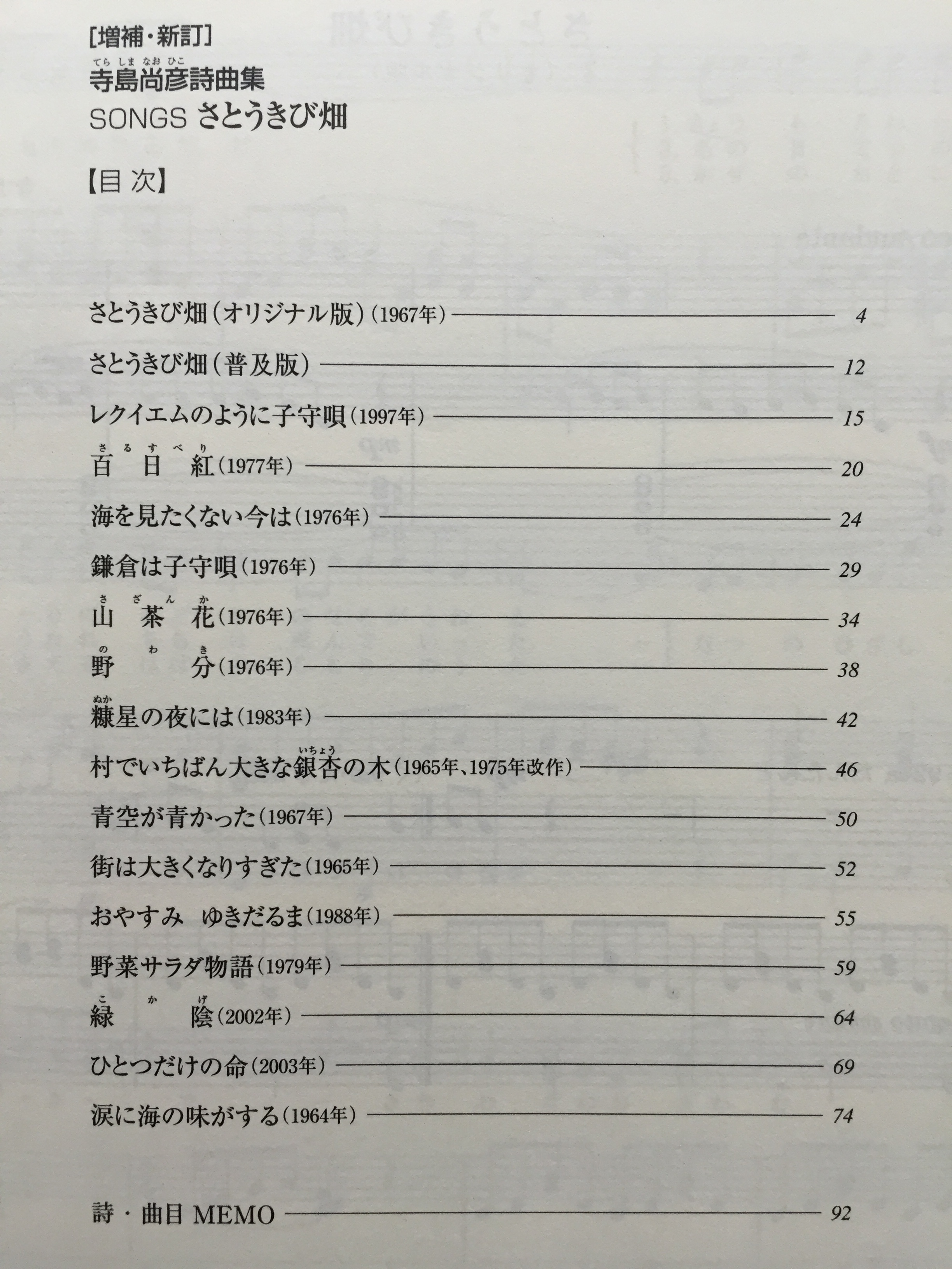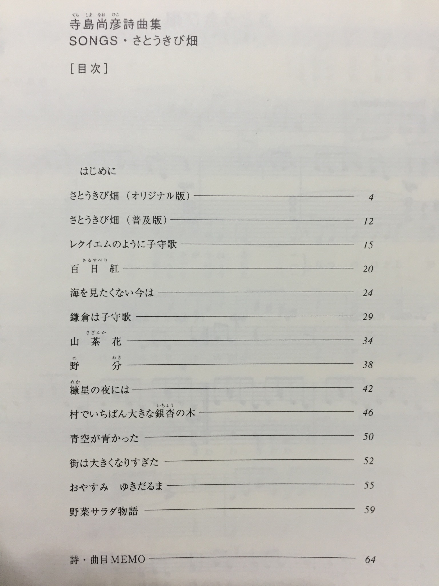 被爆ピアノコンサートで取り上げる曲の中に、さとうきび畑があります。これは矢川さんのリクエストでもあったのですが、被爆ピアノコンサートの尺に合うように編集してあります。寺島尚彦さんの他の曲を見たいなーと思って、楽譜を引っ張りだしたのですが。最初に購入したのがこちら。