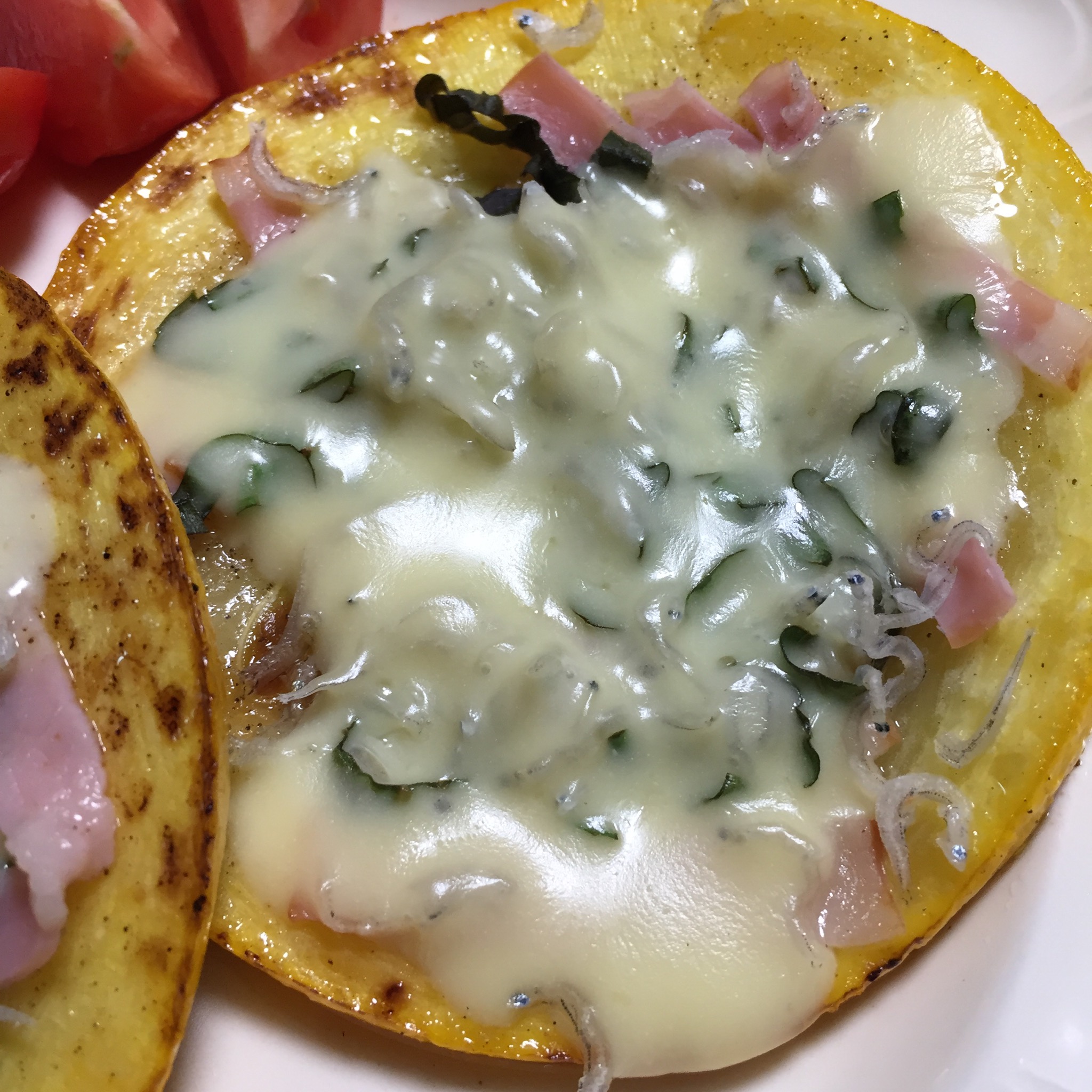 大きいんです。これを横に丸くスライスして、塩こしょうで片面を焼いて…薄く焦げ目がついたら裏返し。細切りのベーコン、バジル、じゃこ、溶けるチーズを乗せて蓋をして蒸し焼き。