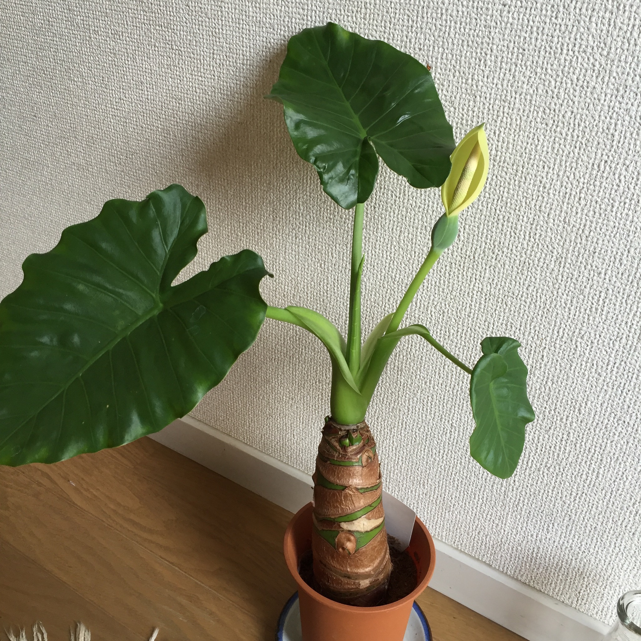 でも日が当たらないので、どうかなーと思っていて。お試しで、とっても安価な、500円くらいの小さいクワズイモを選びました(笑)そしたら、ほどなく、花が咲きまして。