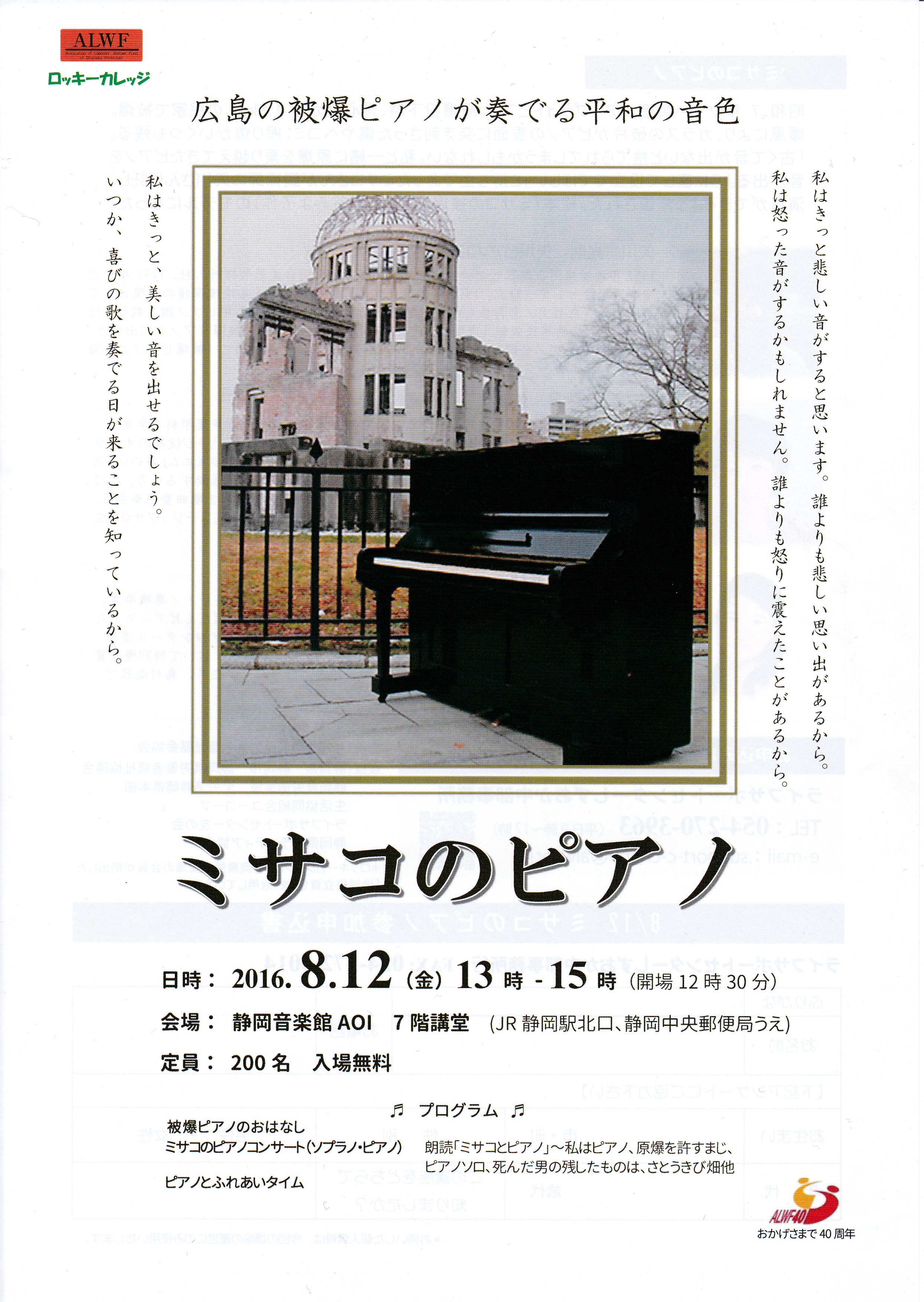 お近くの方、是非この機会に被爆ピアノの音色を聴いて下さい。どうぞ、よろしくお願い致します。皆様のご来場、心よりお待ち申し上げております。