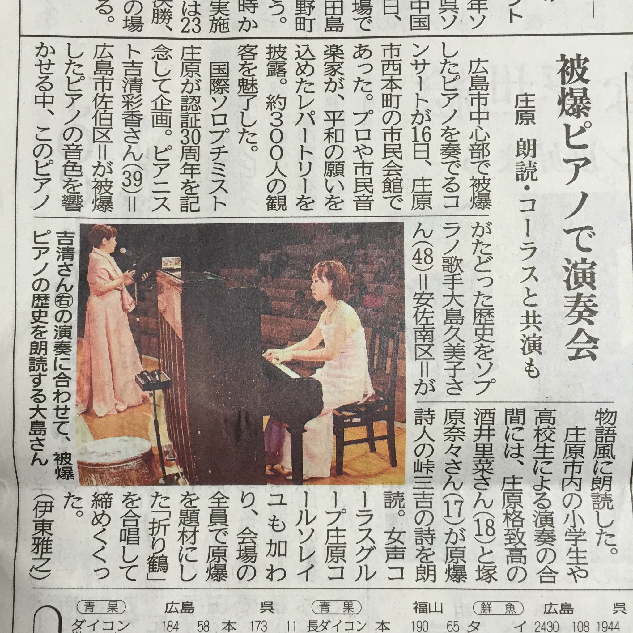 昨日の庄原での被爆ピアノコンサート。その模様が、中国新聞社の本日の朝刊に掲載されていました。ありがとうございます。