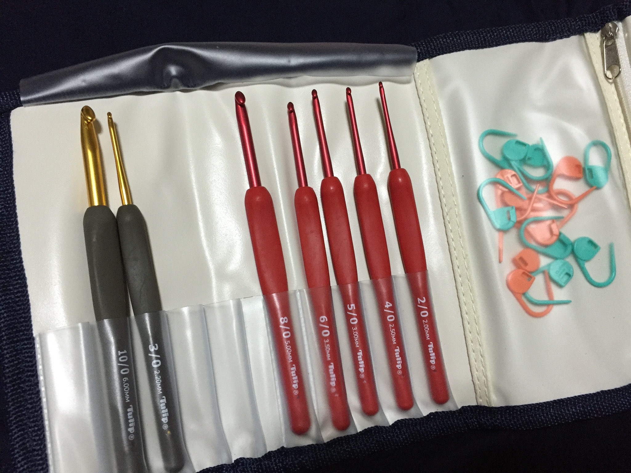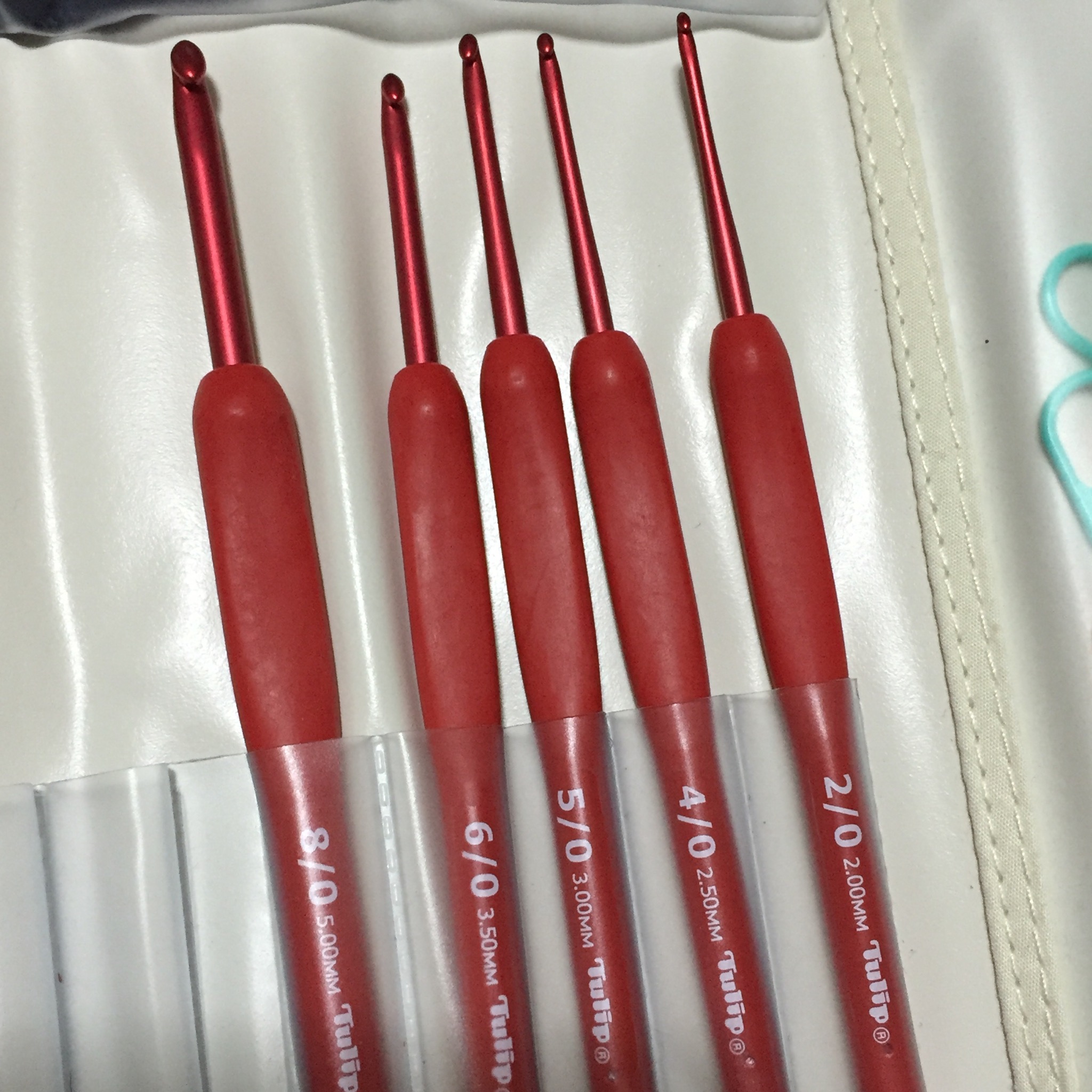 あとはこちら。上のカラー3本は棒針編みで使うのですが、縄編み用のものです。これがないと不便です。