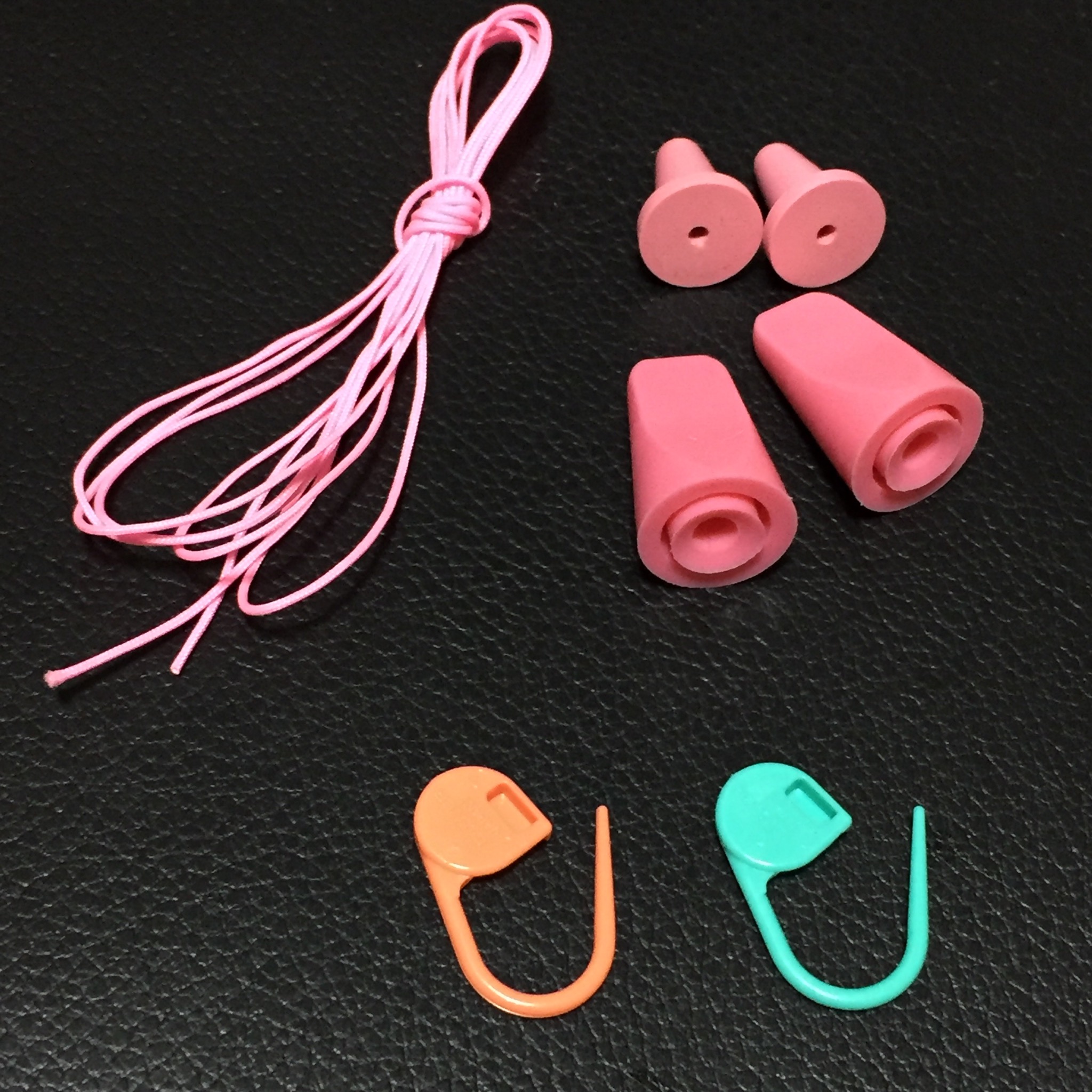あとはグッズ。左上のひもは、作り目用。右上のピンクは、棒針の先にはめて毛糸が外れるのを保護します。とんがってますしね、棒針。欠かせません。