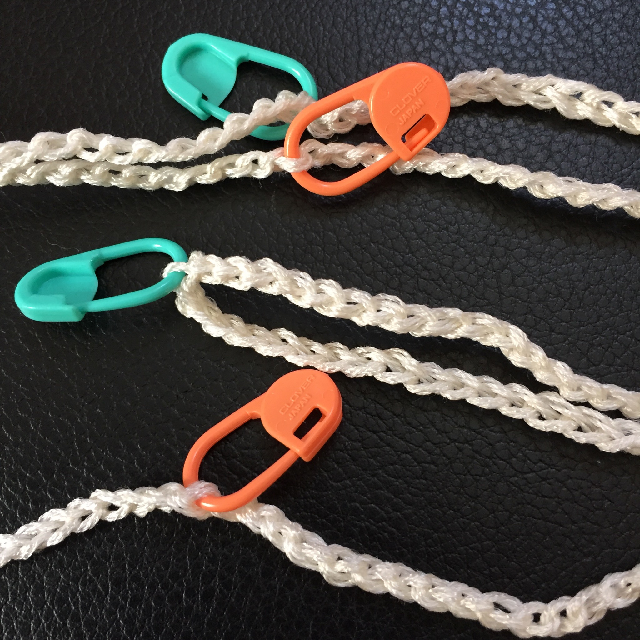 下のオレンジと緑のはクリップ。目を数えて印をつけるのに使います。あとは、かぎ針編みをしていて針を休めるときに、先端に通して留めたりします。