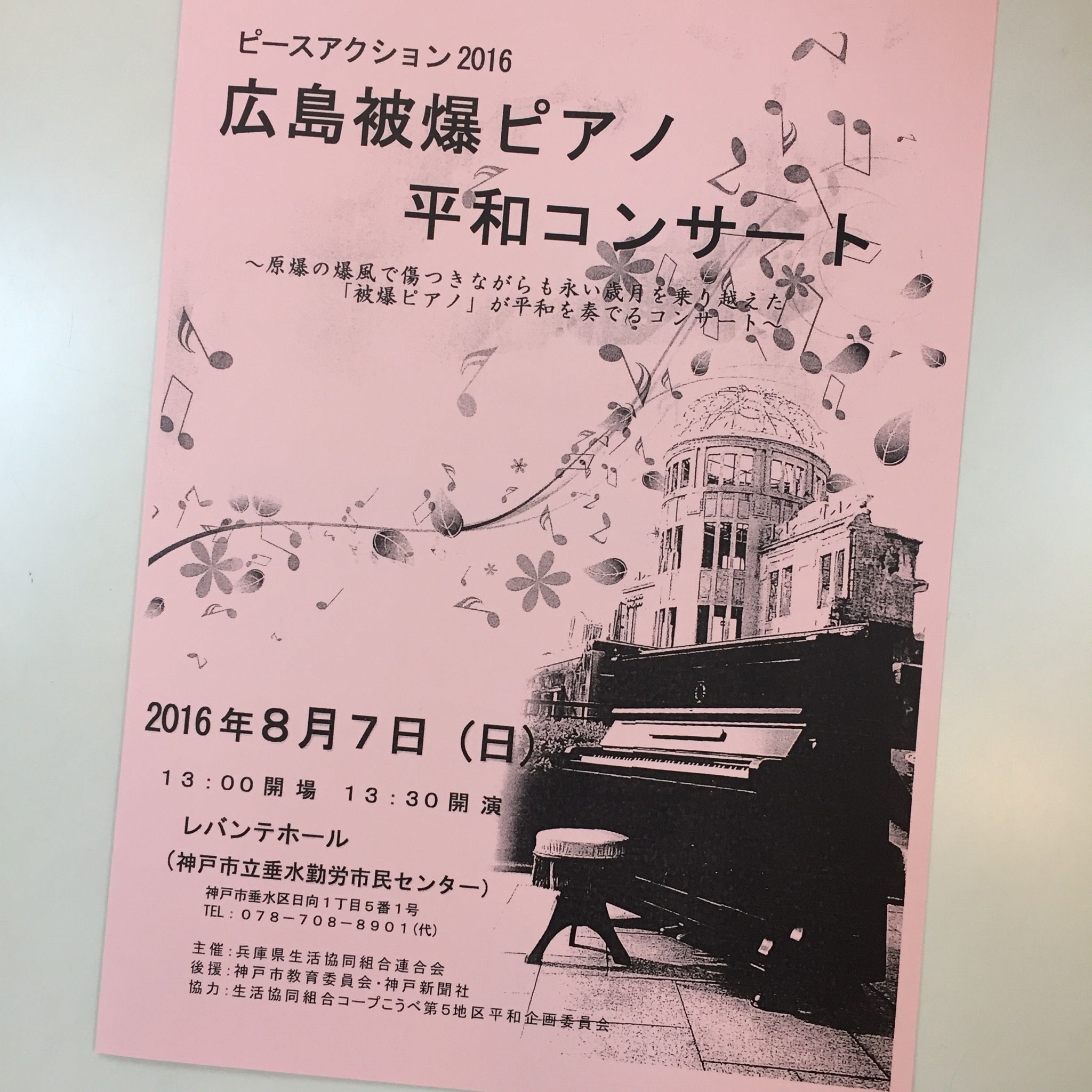 8月7日、主催 兵庫県生活協同組合連合会様、協力 生活共同組合コープこうべ第5地区平和企画委員会様による「ピースアクション2016 広島被爆ピアノ平和コンサート」に出演致しました。