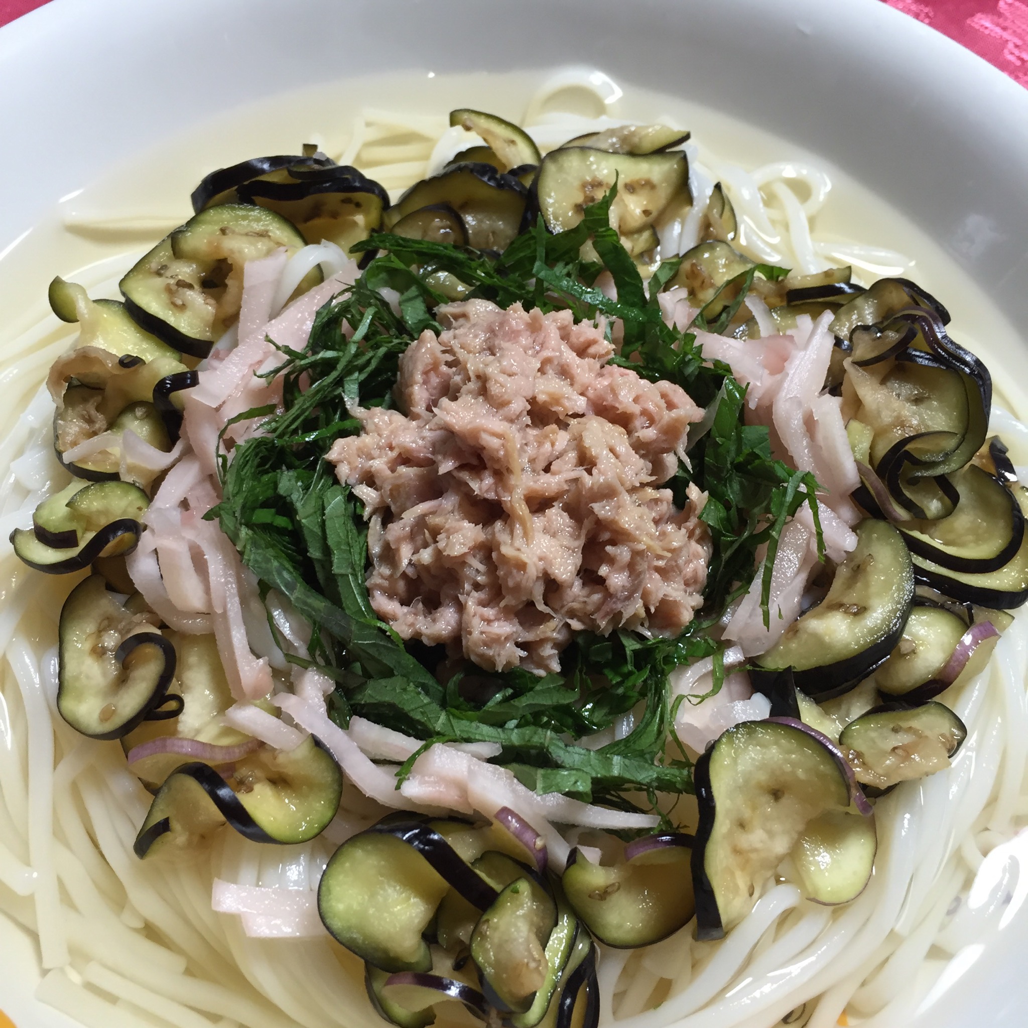 茄子を塩もみして、大葉と、甘酢生姜を千切りに。真ん中にシーチキンをトッピング。