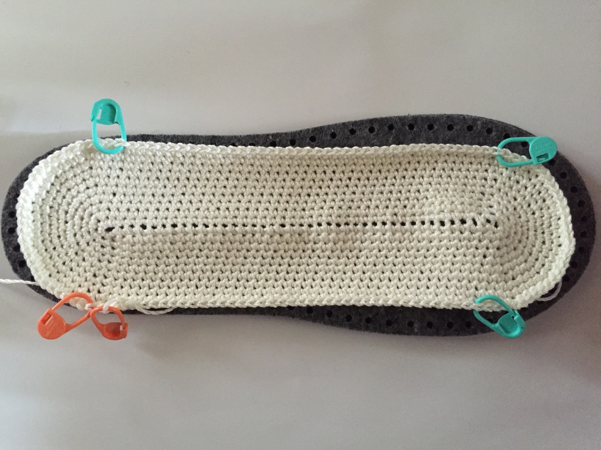 これに両脇を少し編み足して、フェルトの底に編みながら縫い付けるのですが、手が攣りそうになりました(笑)