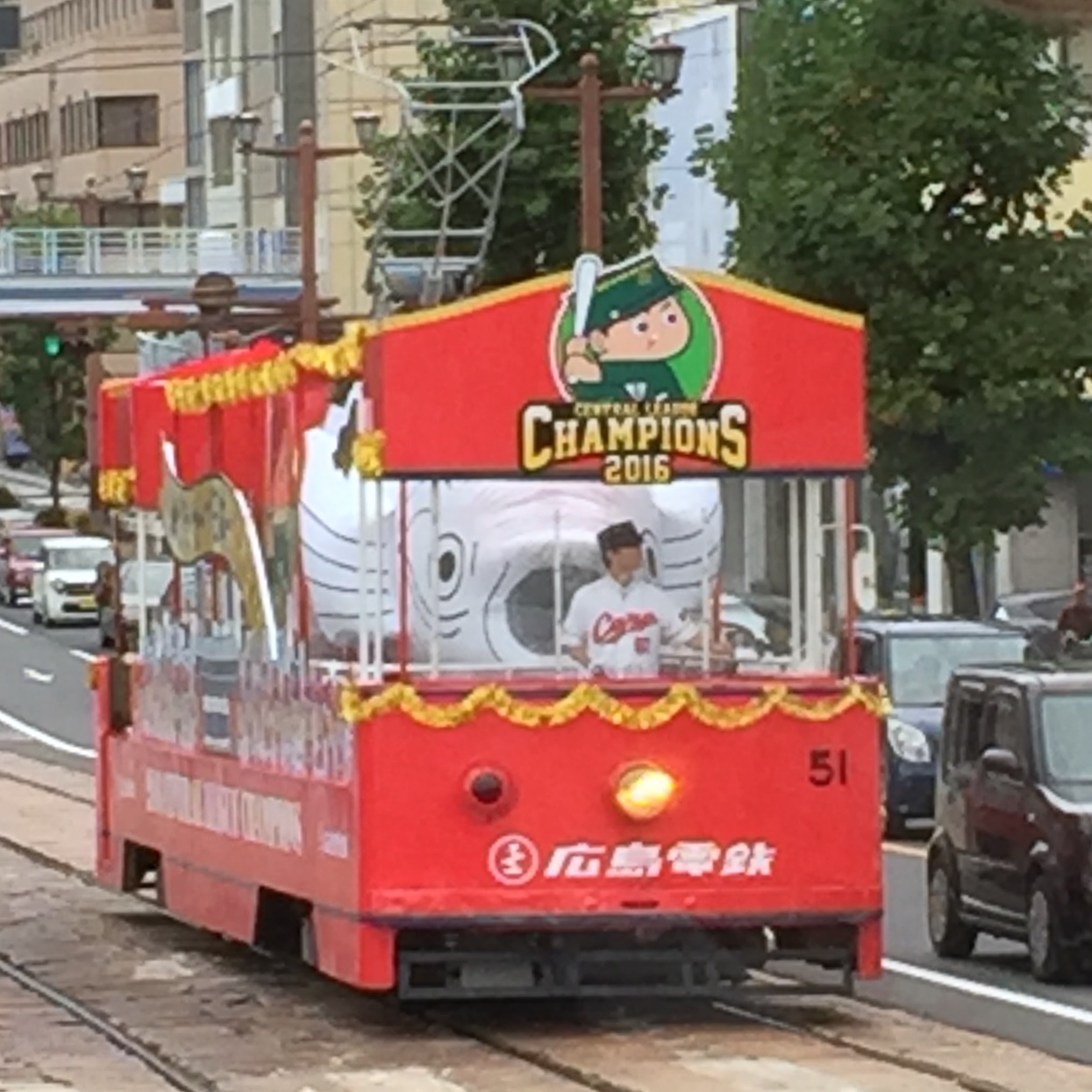 午後ブランクだったので、教室に戻り、編み物教室に遅れて参加しようと移動したら、カープ優勝記念花電車が!