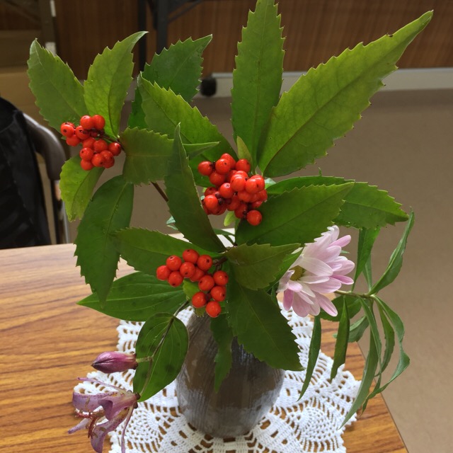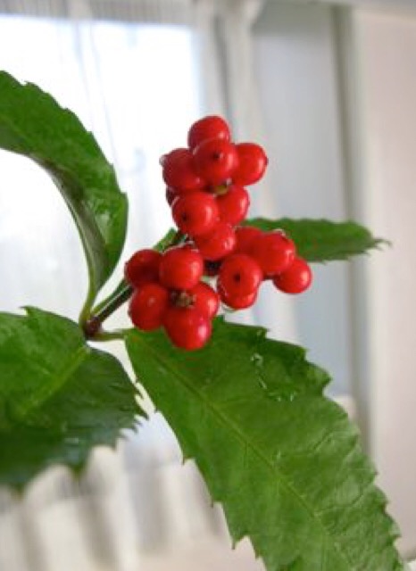 本日のおもてなし花。ありがとうございます。千両。千両と万両の違い、ご存知ですか?