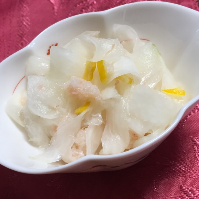 昨日柚子をたくさん頂いたので、冷蔵庫で寝ていた大根と、眠っていた蟹缶を使って朝から酢の物。