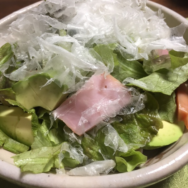 アボカドと、スモークハムとサニーレタス。その上に、けずりかまぼこ。