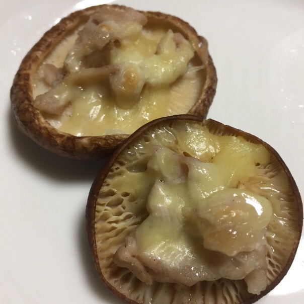 そして、椎茸。塩胡椒した椎茸の傘を逆さにして、豚肉の細切りを乗せて、まずレンジでチン!ラップをして1000Wで1分くらい。溶けるチーズを乗せて、トースターで少しだけ焼けば完成!