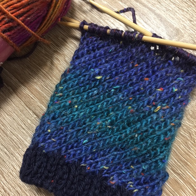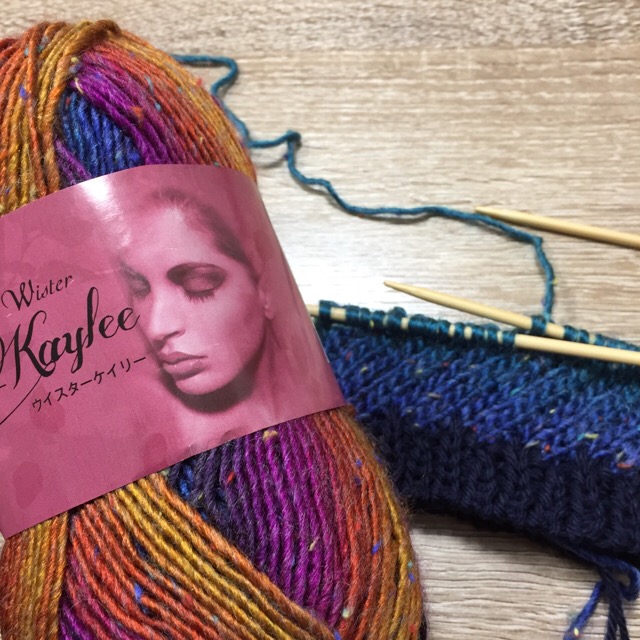 こうなっています。靴下っぽくなってきたでしょ?しかもやっと暖色が出て来ました。嬉しい(笑)このままブルーで、しかも左右全然違う色だったらどうしよう、と編み物の先生とずっと笑っていました。