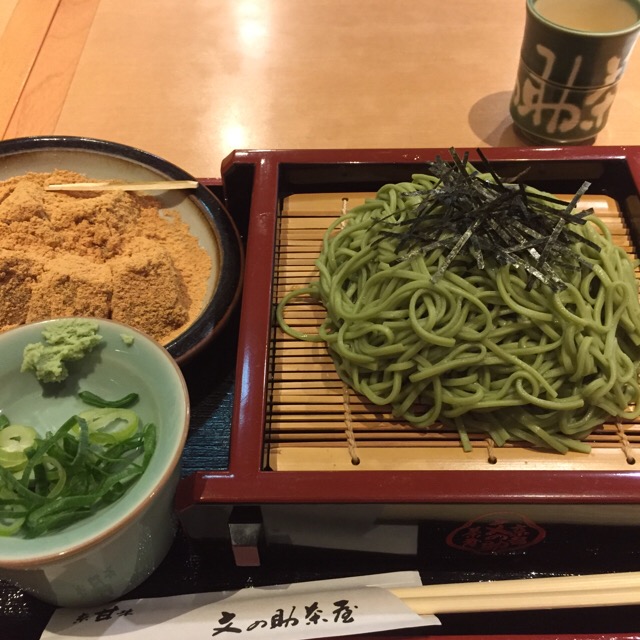 茶蕎麦にしました。美味♡わらび餅とのセット(笑)セットにするかしないかですごーく悩んで、ずーっと悩んで、悩むのが面倒になって、結局セットにしたという…相変わらずな私。