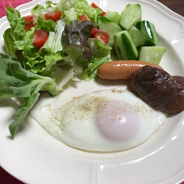 朝ご飯はパン。目玉焼きを作るときに、椎茸もフライパンにイン♡