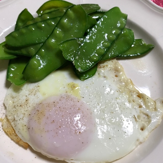 今朝はシンプル。頂いたサヤエンドウをフライパンの片隅で炒めて、フライパンの半分で目玉焼きー!