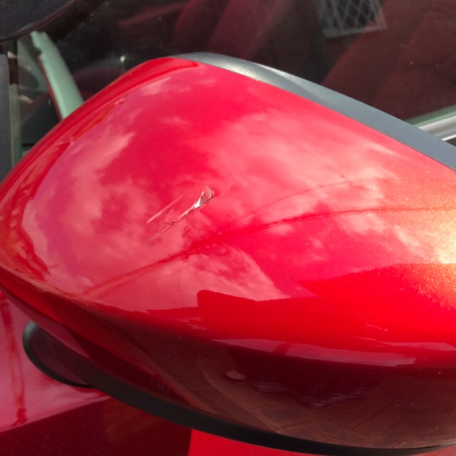 車屋さんで、飛んで来た石で破損し放置されていた(笑)カバーの傷。
