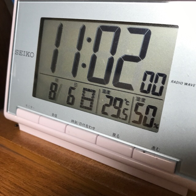朝、クーラーをつけていても、この室温。暑いです。