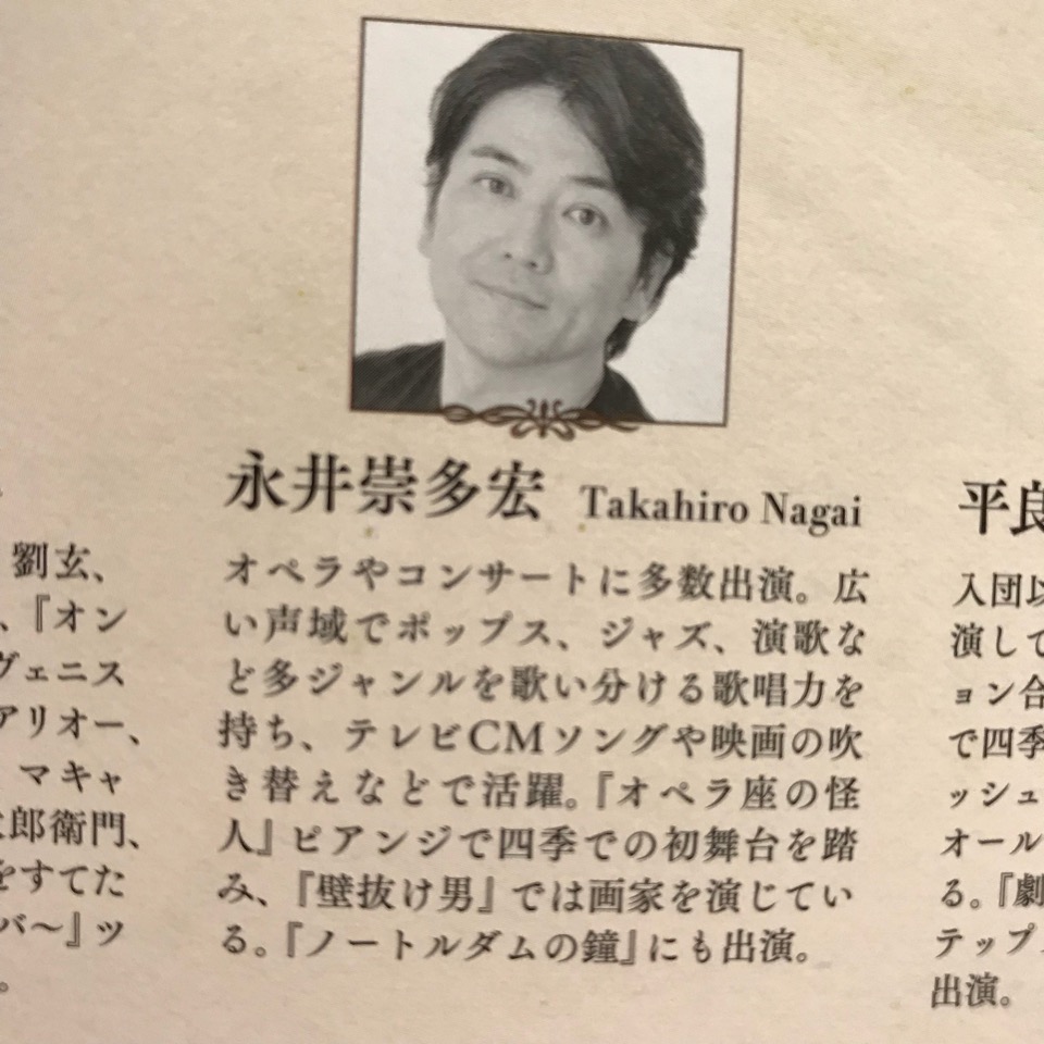 本当に人柄が良く、気遣いが素晴らしく、大学時代から、ほわんとした語り口は変わらず。一緒に居ると楽しくて話が尽きず、互いに変わらない気はしてるんだけど、確実に時間は過ぎていて。でも、こうして、劇団四季という巨大組織の中でキャスト入りするのは並大抵のことではないと思うので、尊敬します。飄々としていますが、「オペラ座の怪人」や「壁抜け男」「ノートルダムの鐘」でキャスト入りし続けるのは、容易な事ではないと思います。努力、ですよね。そして、おそらく人柄もあるのだと思います。続く、って大変なことですから。