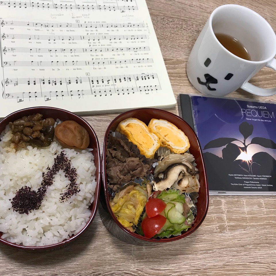 お昼ご飯はいつもお弁当。今日はレクイエムを覚えながら食べました。