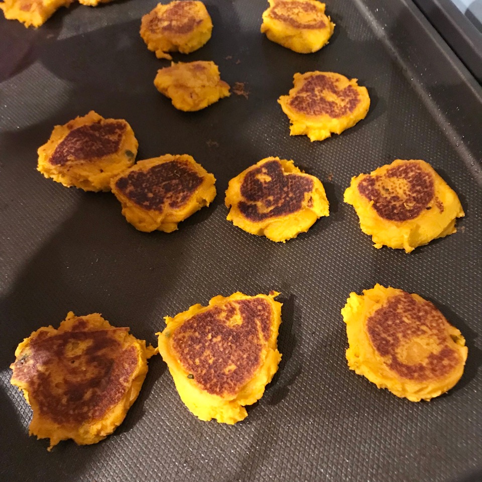 ふかしたカボチャを潰して、片栗粉を混ぜて、お塩を少し入れて、焼く。