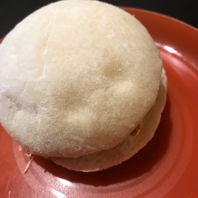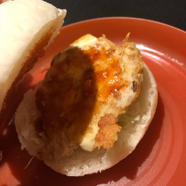 到着したら、おやつの時間。今日は豆腐ハンバーグを挟んだハンバーガー!びっくり!