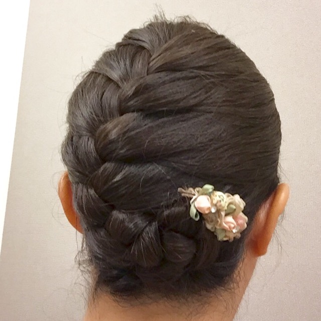 夜会巻きが基本ですが、編み込むともっと楽なので、最近は編み込みます。