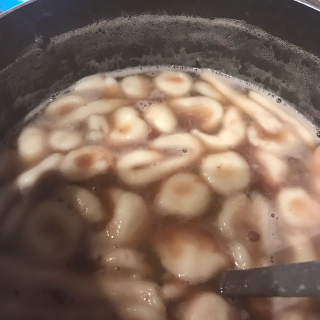 茹で上がると浮いてくるのですが、よーく見てください。細長いのが浮いていませんか?(笑)ヘビと言っていましたが、トッポギみたいですよね。