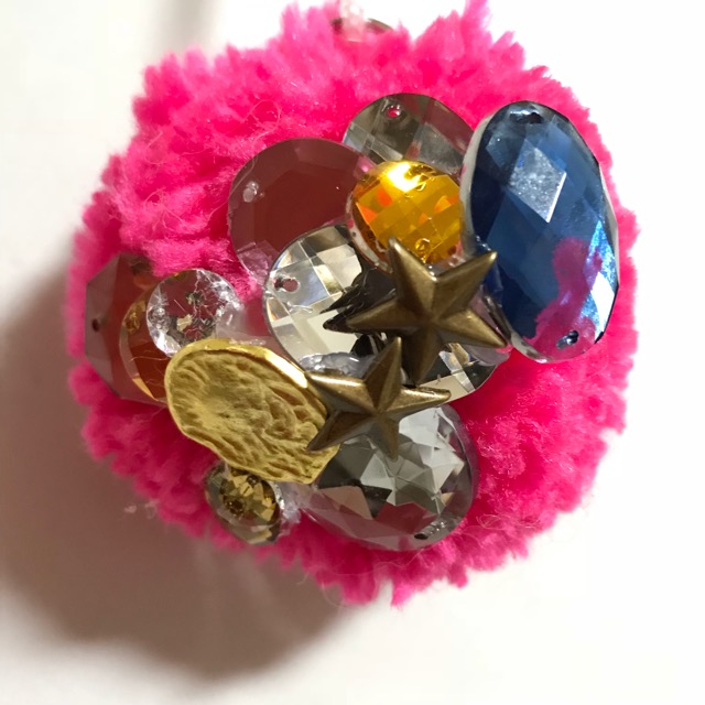 毛糸で作ったポンポンに、ビジューを貼り付けてあります。ありがとう♡照れながら首にかけてくれました。大事に飾りました。キラキラして、とても幸せな気持ちになります。