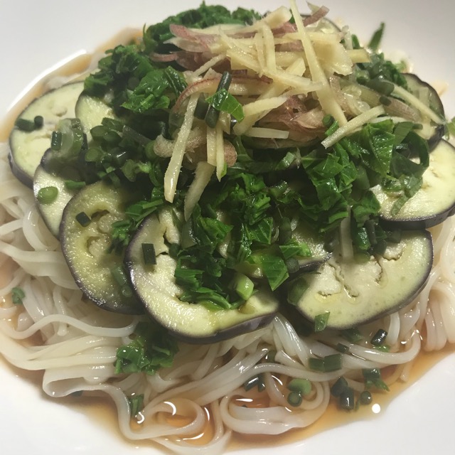 そして、お昼ご飯は、半田麺。茄子をレンチンして、ミョウガ、生姜、コシアブラ、大葉などでトッピングして、頂きました!