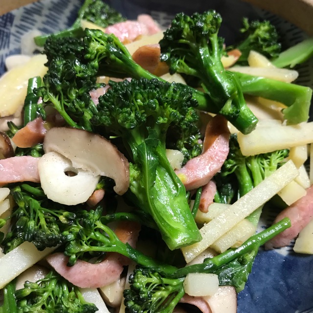 ブロッコリーと、にんにくと、じゃがいも、椎茸のバター炒めで頂きました。