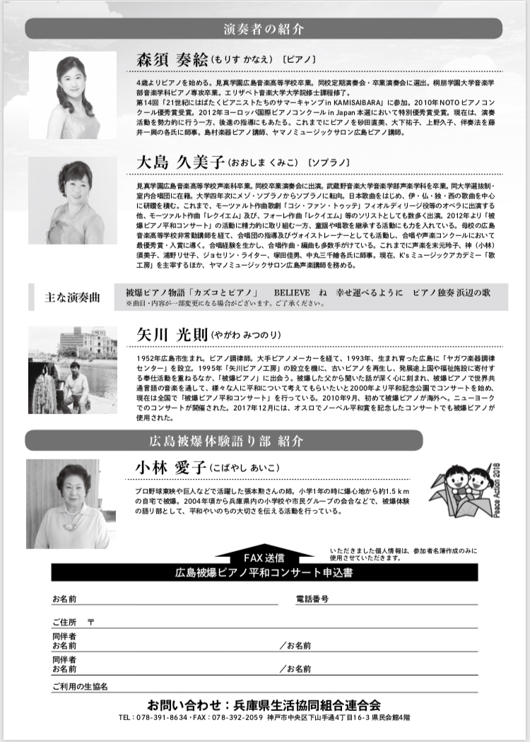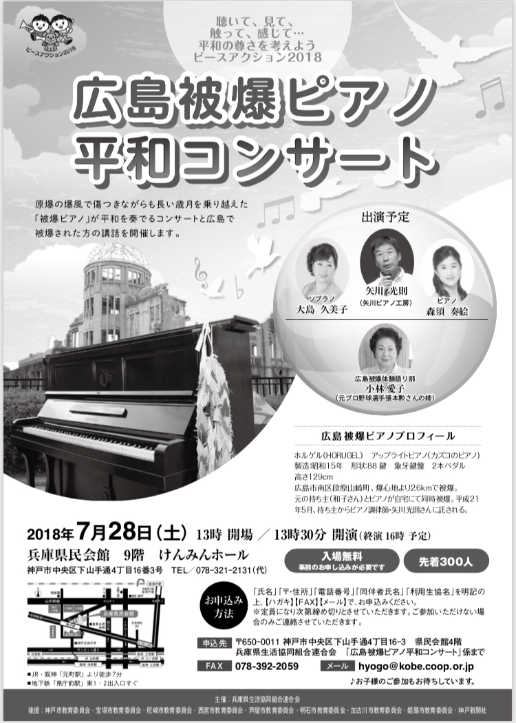兵庫県生活協同組合連合会様主催の被爆ピアノコンサート、大変ありがたいことに、今年もお世話になります。