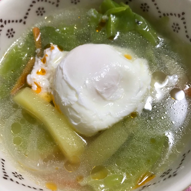 ってことで、急遽生姜入りの中華スープを。ポーチドエッグ添え。