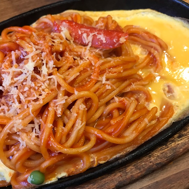 イタリアンスパ玉子ひき。懐かしい感じのナポリタンですが、鉄板で出てくるんです。で、溶き卵を流し入れて、その上にスパゲッティを乗せる!