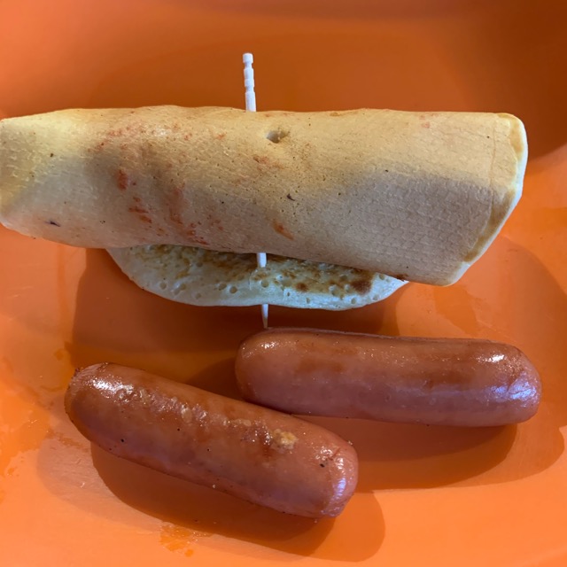 本日のおやつは、ウィンナー巻き?外は甘め、中はウィンナーとケチャップ。これがなかなか美味しくて♡ しっかりいただきました!