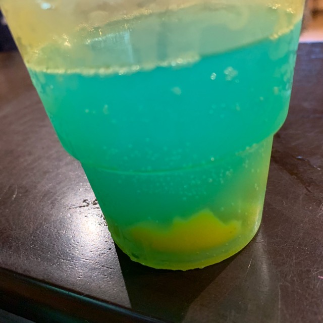 黄桃が型抜きしてありますよー!ブルーハワイとサイダーで作ったゼリー。ショワショワして美味しかったです♡ごちそうさまでした!